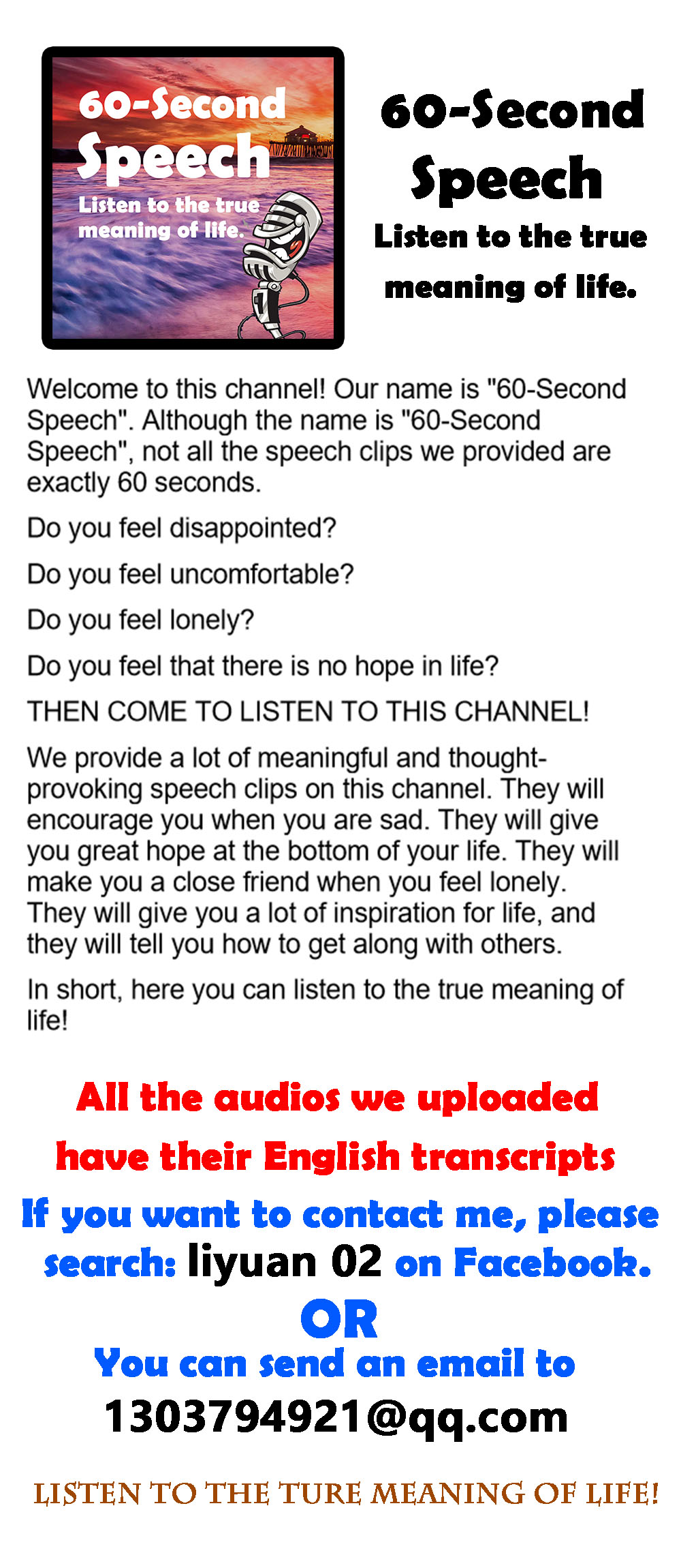 Welcome to this channel! Our name is "60-Second Speech". Although the name is "60-Second Speech", not all the speech clips we provided are exactly 60 seconds.